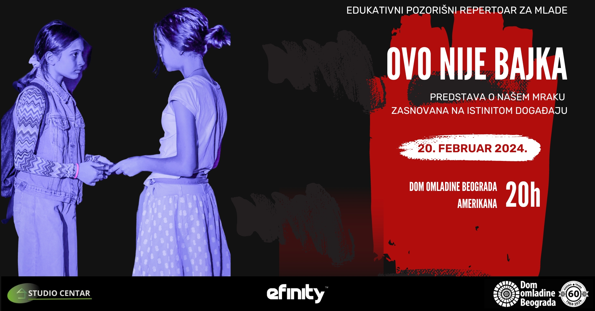 Predstava “Ovo nije bajka” se bavi problemom vršnjačkog nasilja do kojeg dolazi kada nova učenica u školi ne uspe da se nametne u novom okruženju zbog svoje tamnije puti i lošeg materijalnog stanja.