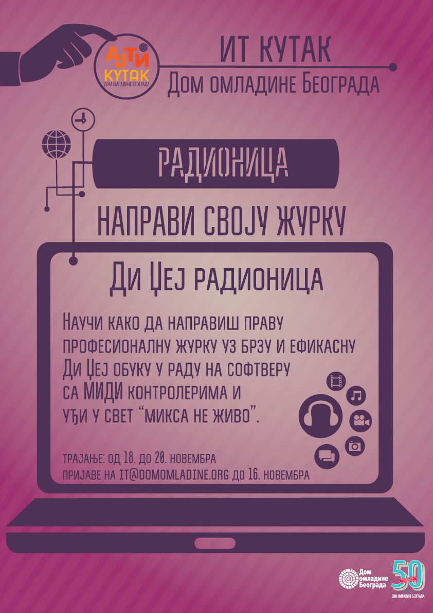 Učešće je BESPLATNO! Prijave sa imenom, prezimenom, kontakt elektronskom poštom šaljite na it@domomladine.org sa naznakom “za DJ radionicu”.