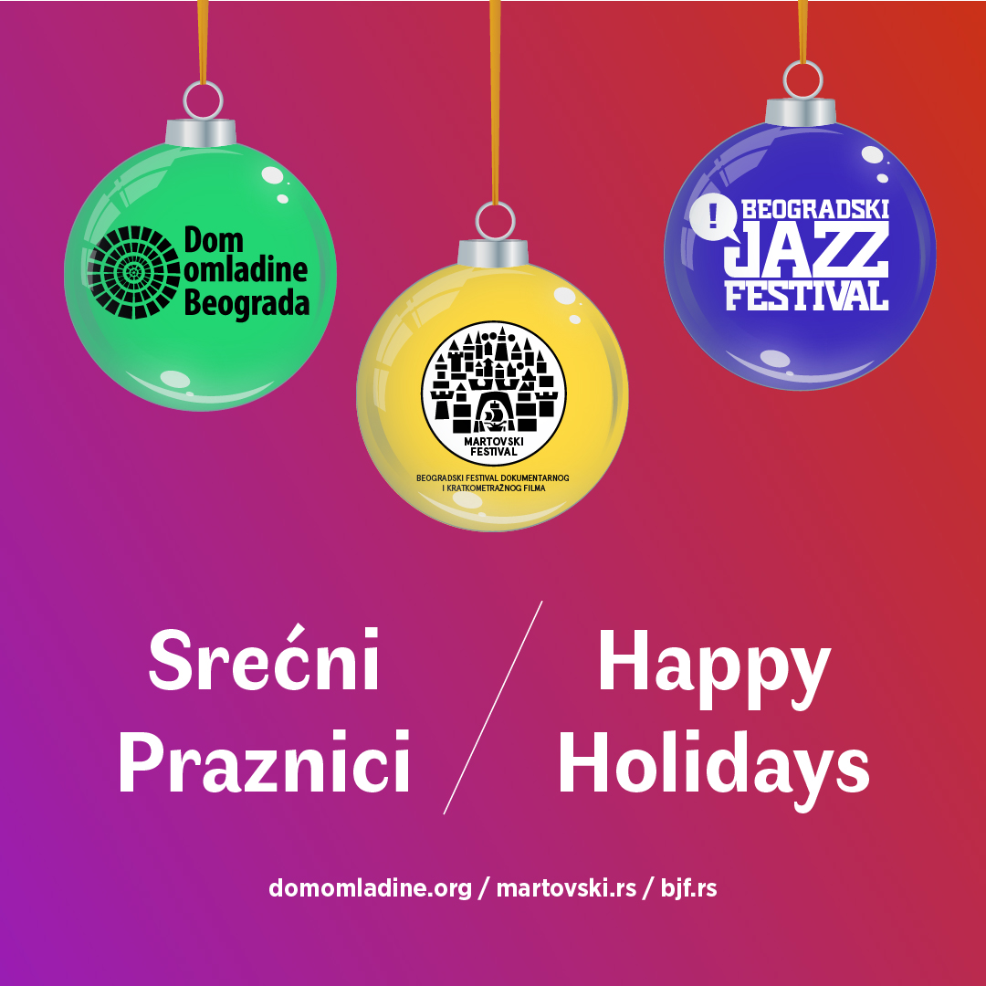 Dom omladine Beograda, Beogradski džez festival i Martovski festival – Beogradski festival dokumentarnog i kratkometražnog filma, svojoj publici, poslovnim partnerima i saradnicima, i svim građanima Beograda i Srbije žele zdravu, srećnu, uspešnu i radosnu 2022. godinu i predstojeće praznike!