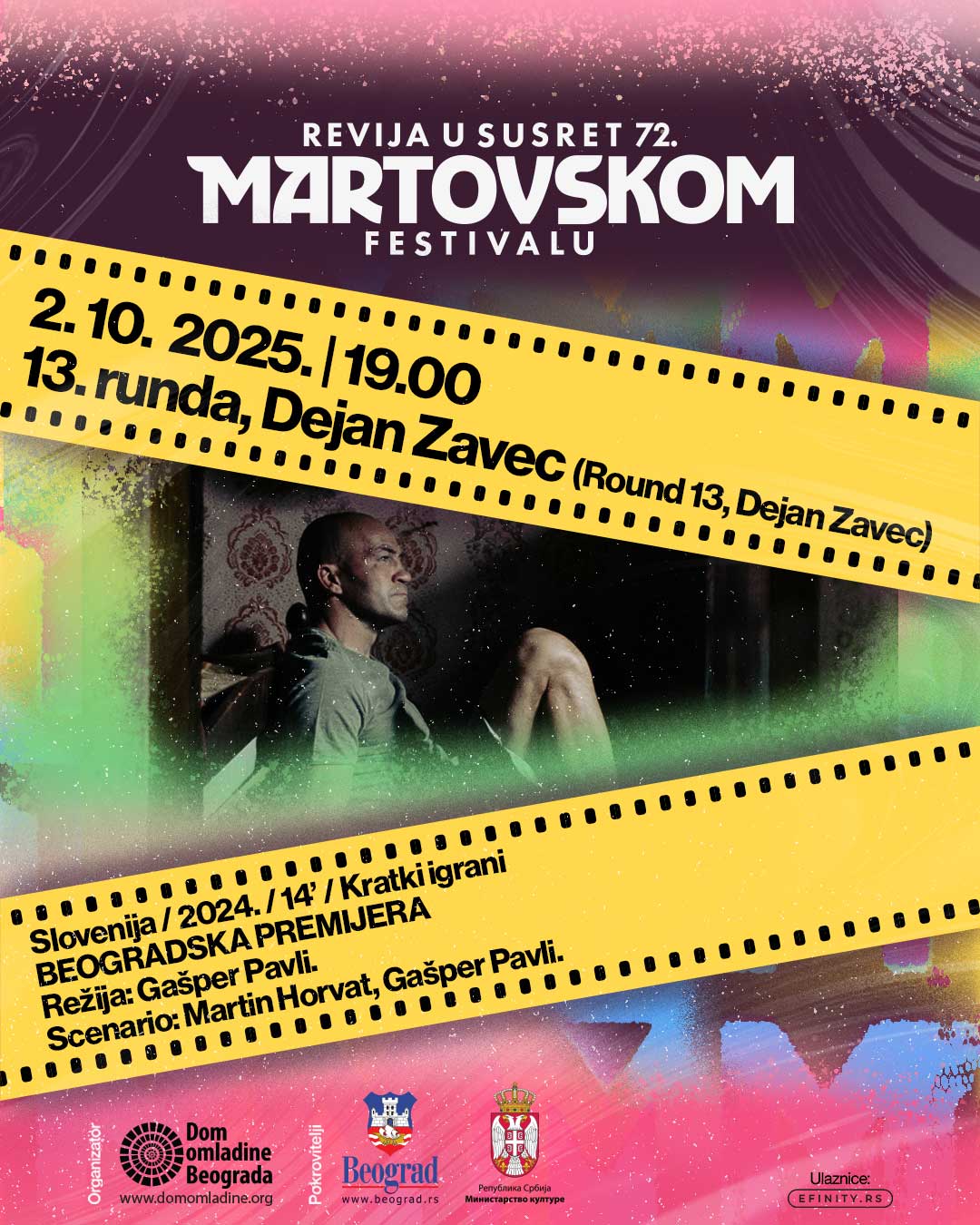 U okviru revije „U susret 72. Martovskom festivalu“, beogradsku premijeru imaće kratkometražni film „13. runda, Dejan Zavec“, u čijem je središtu priča iz života svetskog bokserskog šampiona iz Slovenije. Gosti na premijeri biće reditelj i ko-scenarista Gašper Pavli, ko-scenarista Martin Horvat, pridruženi producent Aleš Pavlin, kao i Dejan Zavec, protagonista i jedan od producenata filma. Oni će se predstaviti publici nakon projekcije, koja je zakazana za 2. oktobar u Velikoj sali Doma omladine Beograda, sa početkom u 19 časova.